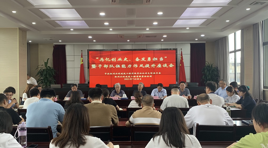 为不断提升年轻干部能力作风建设,增强干部职工对企业的认同感和归属感,协力开启公司“二次创业”新征程,7月28日上午,扬州水利建筑有限责任公司召开“再忆创业史、奋发勇担当”暨干部队伍能力作风提升座谈会。公司班子成员、中层以上干部、本部全体职工及退休职工代表参加活动。