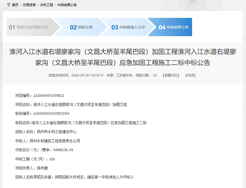 喜报!公司中标淮河入江水道右堤廖家沟应急加固工程施工二标项目